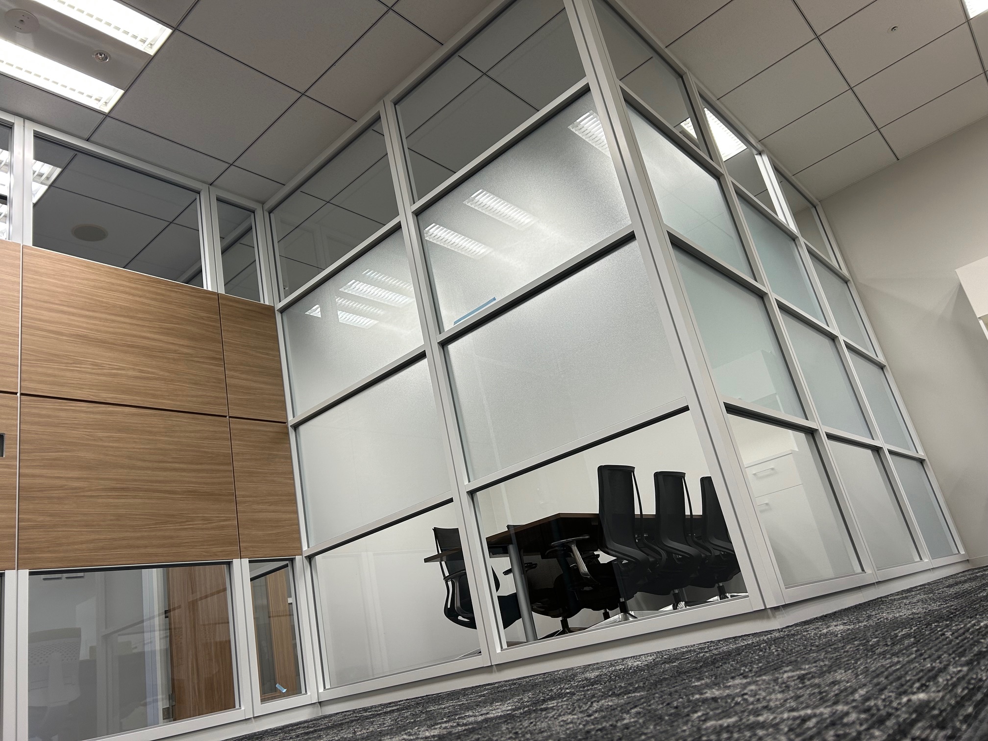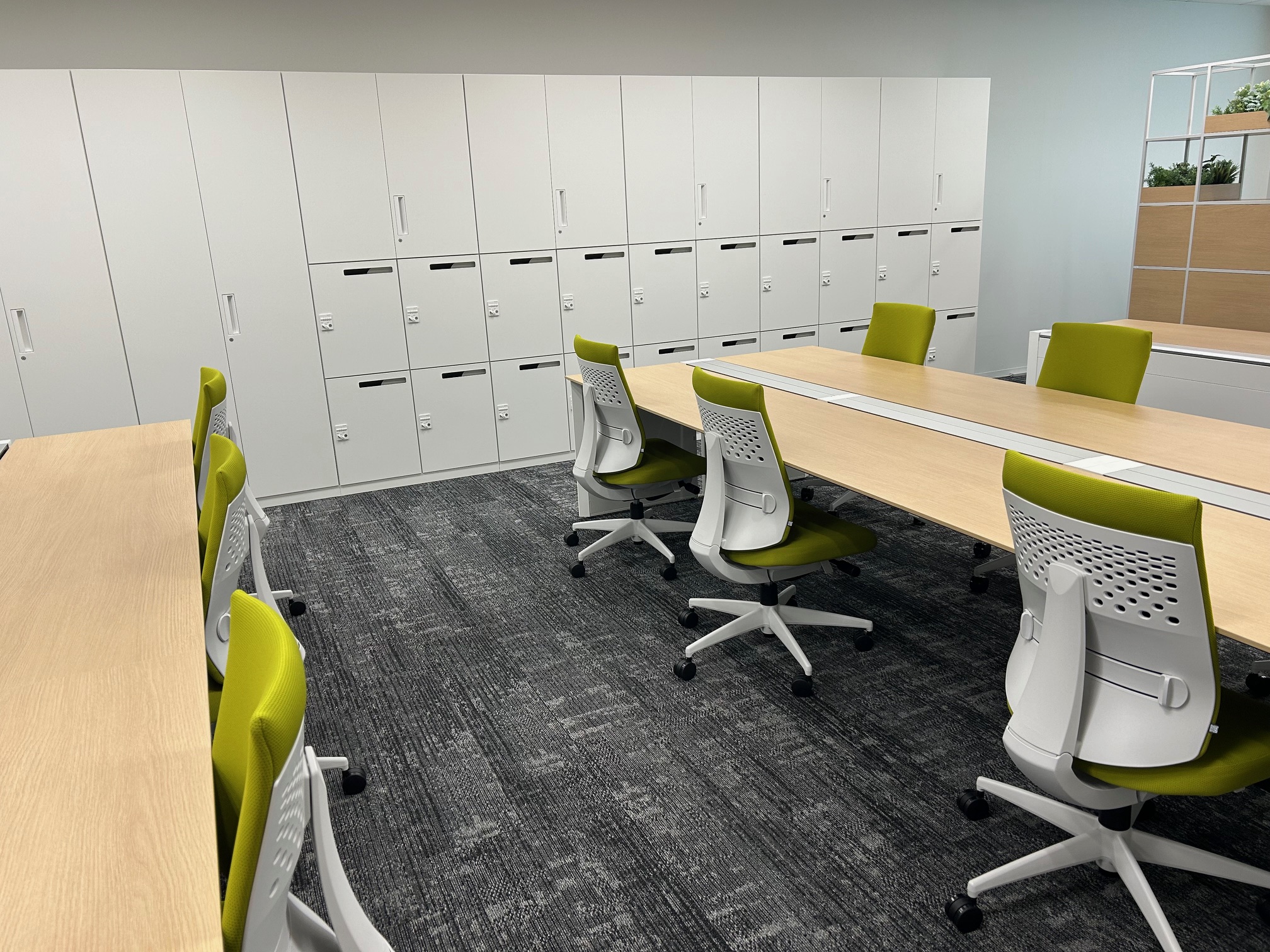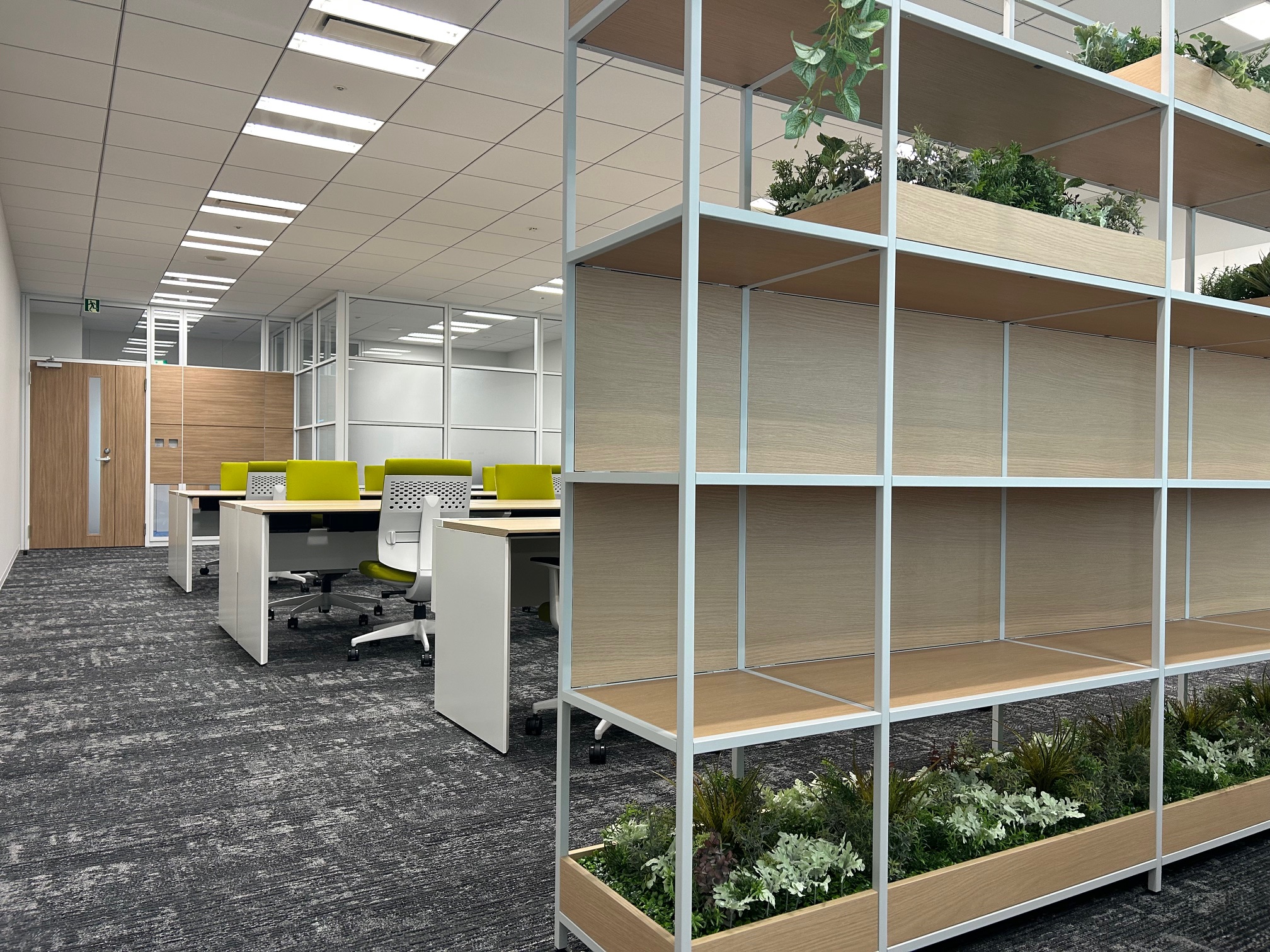 事業拡大に伴い横浜に新規事務所を開設 快適なオフィス環境を掲げ、フォレスト効果でリフレッシュ空間を演出 グリーンと木目の調和で癒され、ガラスのぬけ感で空間の広がりを演出 限られたスペースを快適に過ごせる空間造りを目指しました